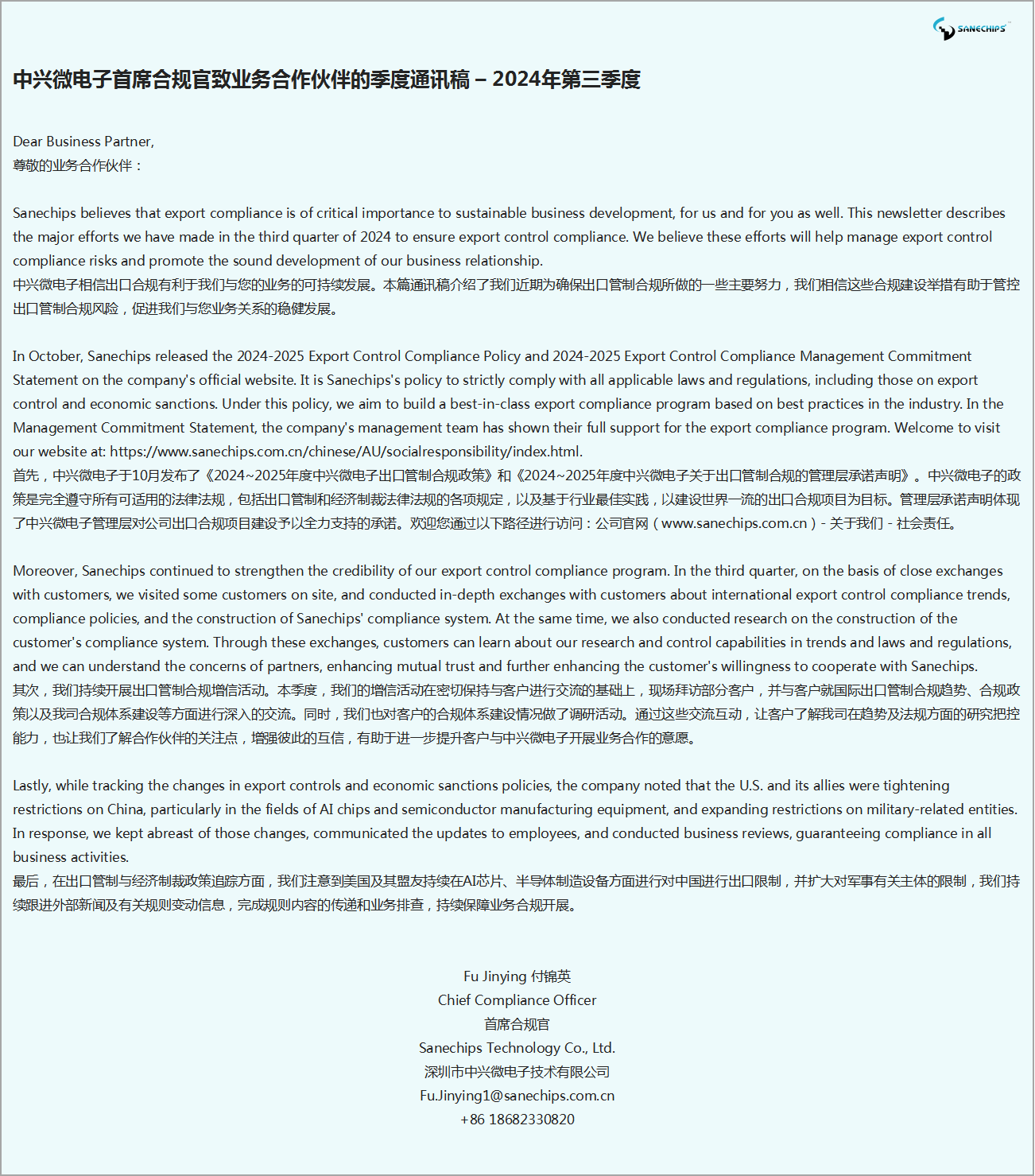 中兴微电子首席合规官致业务合作伙伴的季度通讯稿 – 2024年第三季度