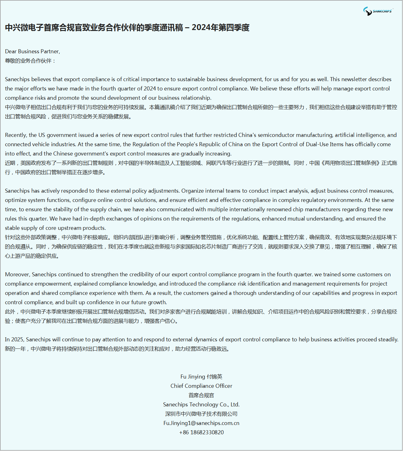 中兴微电子首席合规官致业务合作伙伴的季度通讯稿 – 2024年第四季度